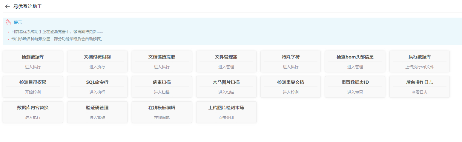 易优系统助手插件主要方便用户诊断系统,自行修复疑难杂症,及一些sql操作功能,后续持续更新增加安全、维护方面功能,方便用户防护好自己的网站。